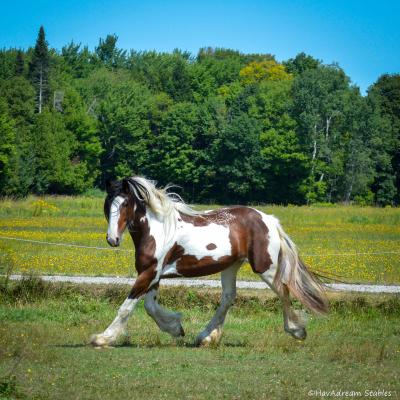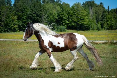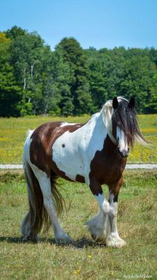 Stunning and flashy 6-year-old Drum Mare, Bay Tobiano, 16.1 hands. She is registered with the IDHA, F1 with 50% Clydesdale and 50% Gypsy. She is started under saddle, green broke to ride, with a few trail rides. She has been easy going, steady, no spook to anything, but been worked and ridden with an experienced friend horse by her side. She will go anywhere and through anything. She is easy to handle, lots of ground work, ties, leads, trailers. She is a gem to groom or handle by anyone, adults and kids. Easy keeper in a herd at pasture, and so clean inside the stables at night. Sound body and mind. Excellent for farrier, barefoot. We can assist in travel all over Canada and USA. Please write us an email for much more info and pictures. | |||