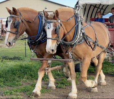 Here's your chance to own Rick and Riley, a pair of beautiful Belgian draft horses. At just 17 years old and over 18 hands tall, these gentle giants are a trustworthy team, perfect for work, beginners, and even holiday sleigh rides! All the hard work has been done, allowing you to enjoy these boys stress free. Although they are being sold as a pair, they can drive single. | |||