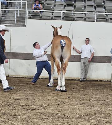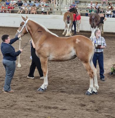 Modern front end yearling, white stripe, mane & tail with 4 white socks. She is show ring proven in 2025 at Illinois State Fair, Indiana State Fair/Nat'l Belgian Show & DuQuion State Fair. She has a pleasant barn disposition. Can shoe & trim free standing in cross ties. Clean pasterns & hocks. She is a clean, smooth & fancy filly. | ||||||||||||||||||