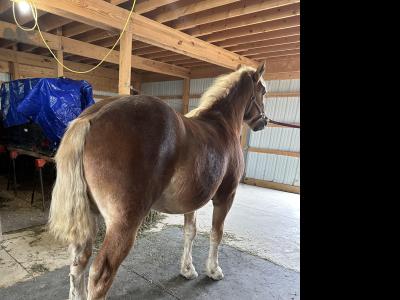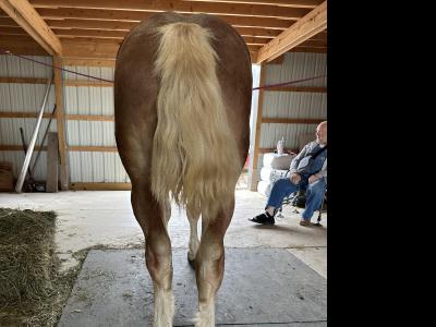 Coming 2 year old Brabant x Haflinger stud. Has 60 days training at the amish, started under harness. Measures to finish out around 60 inches. Loads, ties, stands for the farrier. Easy to handle and be around. Confirmationally very clean. Bred for pulling but could easily go any direction. Call or text Brian Myers at 440-822-9664 for more information. | |||