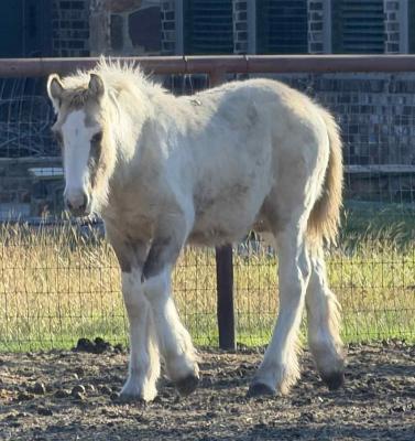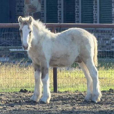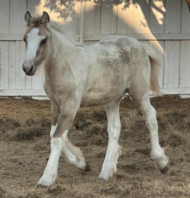 Stunning colt with all the fancy trimmings you could ask for. Beautiful head, tippy little ears, beautiful neck and short couple back. Combined with nice solid bone and lovely feather, this boy is a winner all the way around. He has Silver, Cream, and Dun to fit any of your mares, or be a showstopper gelding. Tons of potential with little boy and his sire is KNOWN for producing top quality Gypsy Vanners. Wonderful bloodlines back up this little colt and the foundation is set for whatever you'd like to do with him. Silver / Cream / DUN and a single tobiano!!! Ee/nZ/nCr/nD/nT Neg: Pssm1/FIS GVHS Registered WOWZA bloodlines on this baby!!! HE is incredible!!! | ||||||||||||||||||